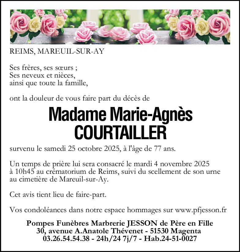 C’est avec une grande tristesse que nous vous annonçons le décès de Marie-Agnès COURTAILLER survenu le samedi 25 octobre 2025 à Reims. La cérémonie se déroulera le mardi 04 novembre 2025 à 10h45 à l’adresse suivante : Crématorium de Reims - Avenue Maurice Plongeron - 51100 Reims.