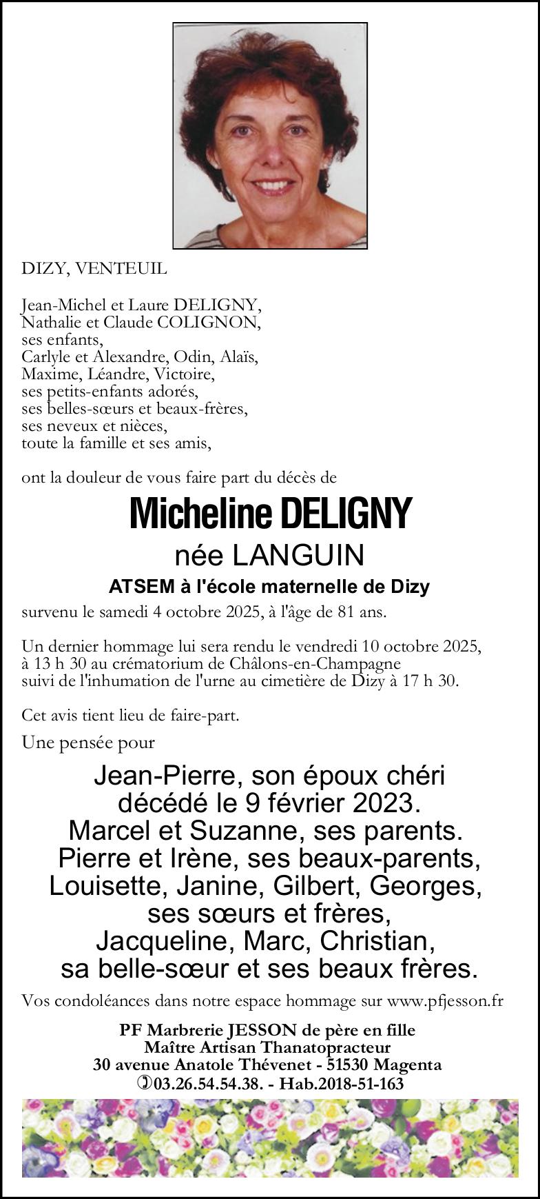 C’est avec une grande tristesse que nous vous annonçons le décès de Micheline DELIGNY survenu le samedi 04 octobre 2025 à Aÿ-Champagne.